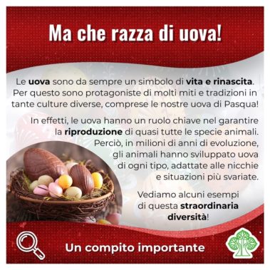 In occasione della Pasqua, ecco un approfondimento su uno dei simboli più famosi di questa festa nella cultura occidentale: le uova! Grandi, piccole, colorate, ornamentate… nel regno animale se ne vedono di tutti i colori! D’altronde, l’uovo, per la maggior parte delle specie animali, ha una missione importantissima e molto delicata: proteggere una nuova generazione di organismi e permettere loro di svilupparsi fino a che non saranno in grado di avventurarsi nel mondo. Di conseguenza, la selezione naturale si è sbizzarrita su di loro ed oggi gli animali mettono in gioco tante strategie diverse per proteggere le uova, tenerle al sicuro, evitarne la predazione, ancorarle al substrato… Attenzione però: su un elemento così delicato, il cambiamento climatico e l’azione dell’essere umano possono avere effetti devastanti. Qualsiasi impatto sull’anello di congiunzione tra una generazione e la successiva può in breve tempo destabilizzare una popolazione e causarne la scomparsa! Fateci sapere se siete interessati a uno degli argomenti di questo post: chissà che in futuro non si possa approfondirlo!