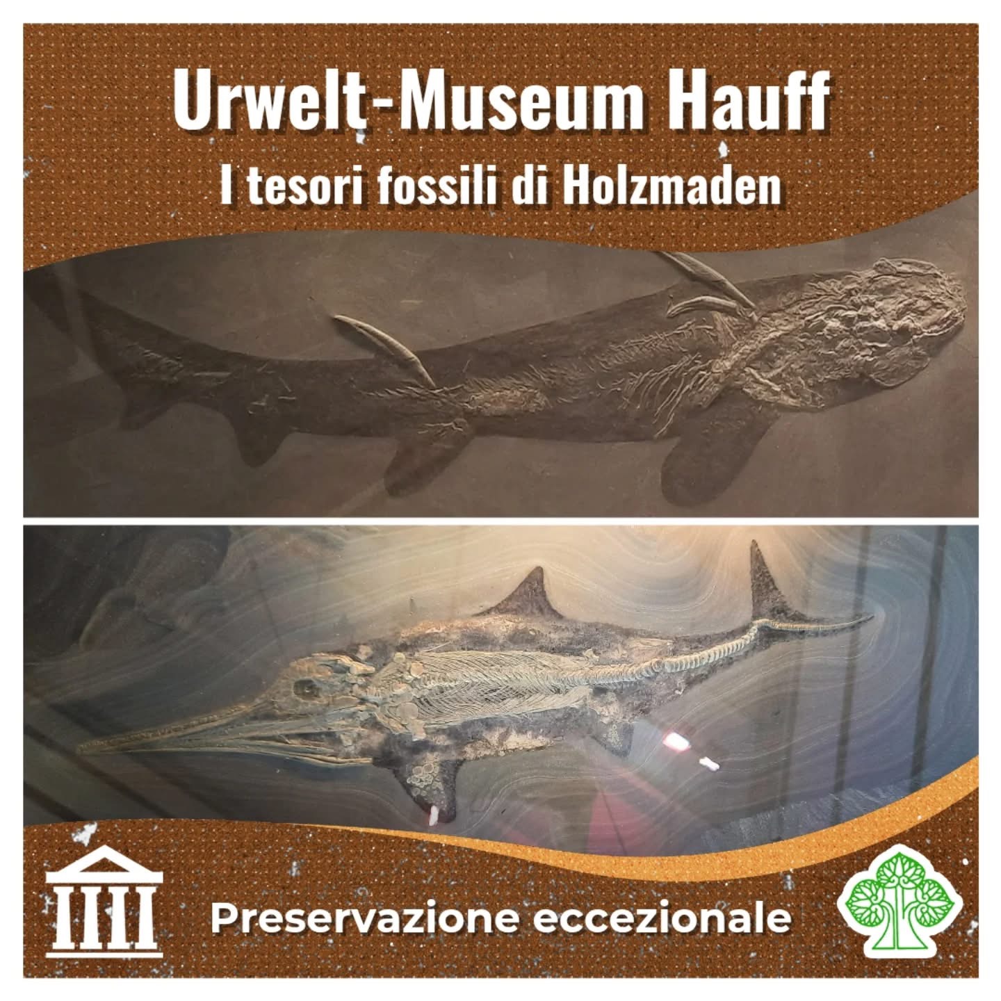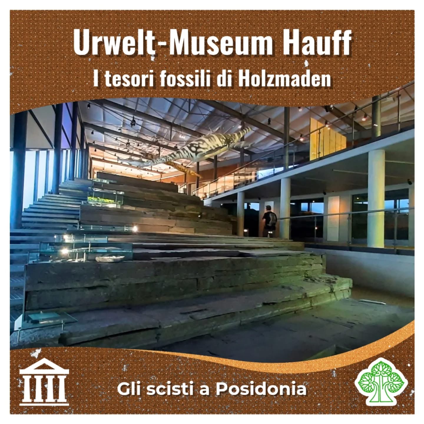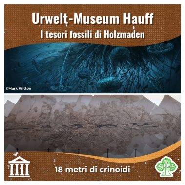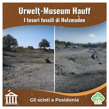 Un autentico tesoro nascosto nella campagna sveva è la collezione di fossili dell’Urwelt-Museum Hauff. Questo museo si trova nel piccolo comune di Holzmaden (Baden-Württemberg, Germania), divenuto celebre tra paleontologi e collezionisti grazie agli affioramenti degli scisti a Posidonia (slides 2, 3): rocce che hanno restituito un’incredibile quantità di fossili, spesso conservati in modo eccezionale, persino con resti di tessuti molli. Alcuni degli esemplari più spettacolari sono oggi esposti proprio all’Urwelt-Museum, fondato nel 1936 a partire dalle collezioni private di Bernhard Hauff (slide 4).