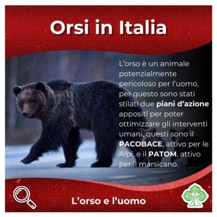 Nonostante l’orso sia potenzialmente pericoloso per l’uomo, esistono piani di azione per gestire i rischi e promuovere la coesistenza, come il PACOBACE per l’Orso bruno alpino e il PATOM per l’Orso marsicano. Il Parco Nazionale d’Abruzzo ha messo in atto misure preventive, come l’installazione di cassonetti anti-orso e la chiusura di sentieri nei periodi critici, per ridurre al minimo il contatto tra uomo e orso.